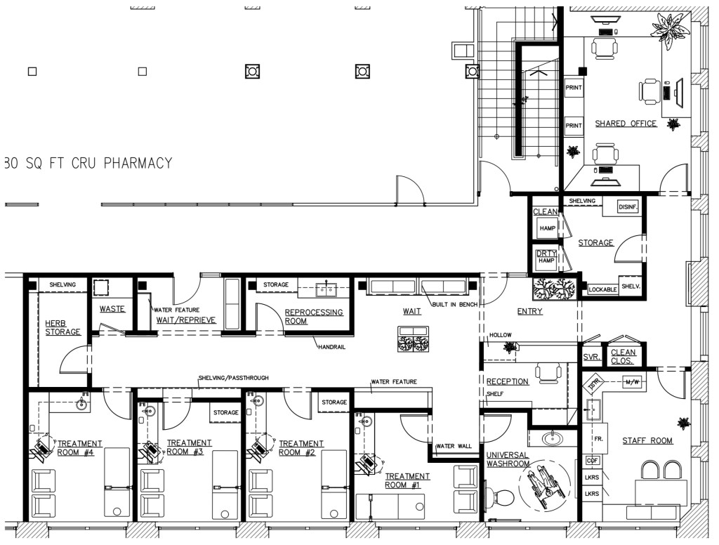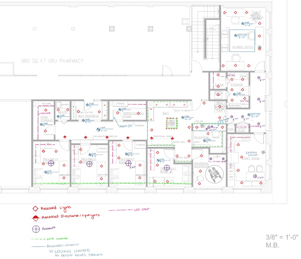 The 5 elements of TCM: Fire, Water, Metal, Earth, and Wood are all represented throughout the space, and a key characteristic of the clinic is the use of these elements as wayfinding cues. By increasing the legibility of the space and creating defined landmarks, the goal is to reduce patient anxiety in a typically stressful environment.
