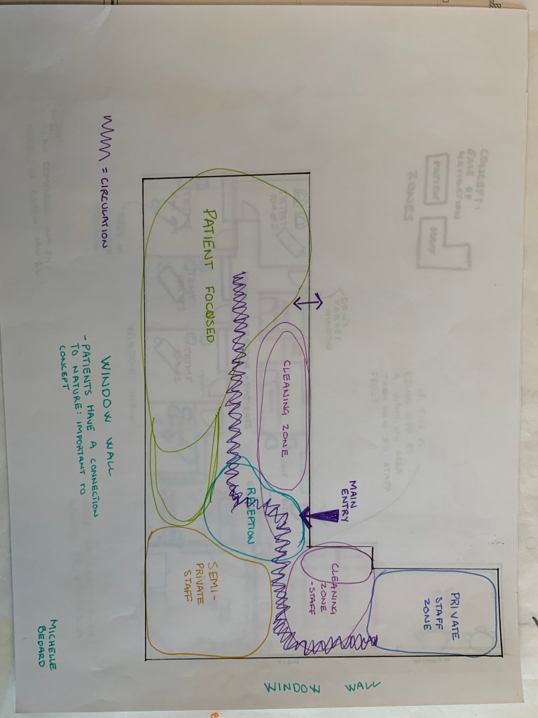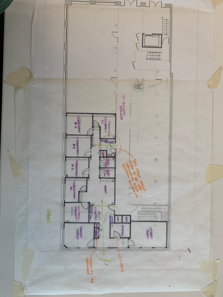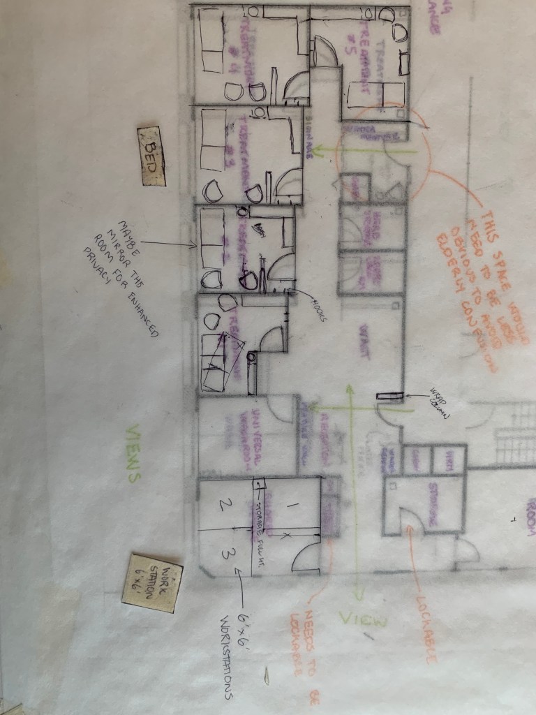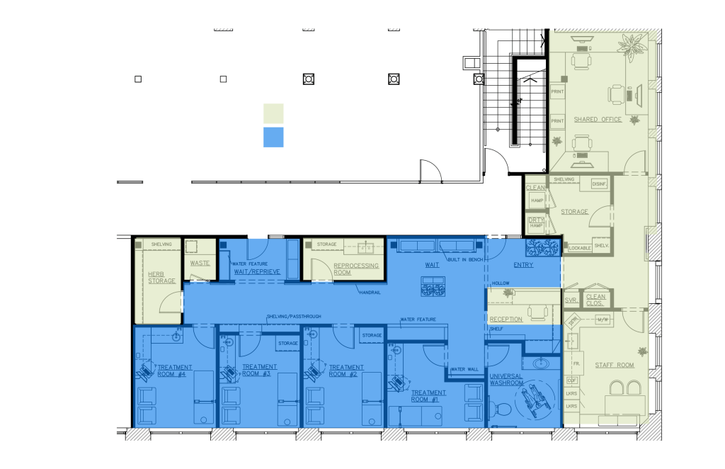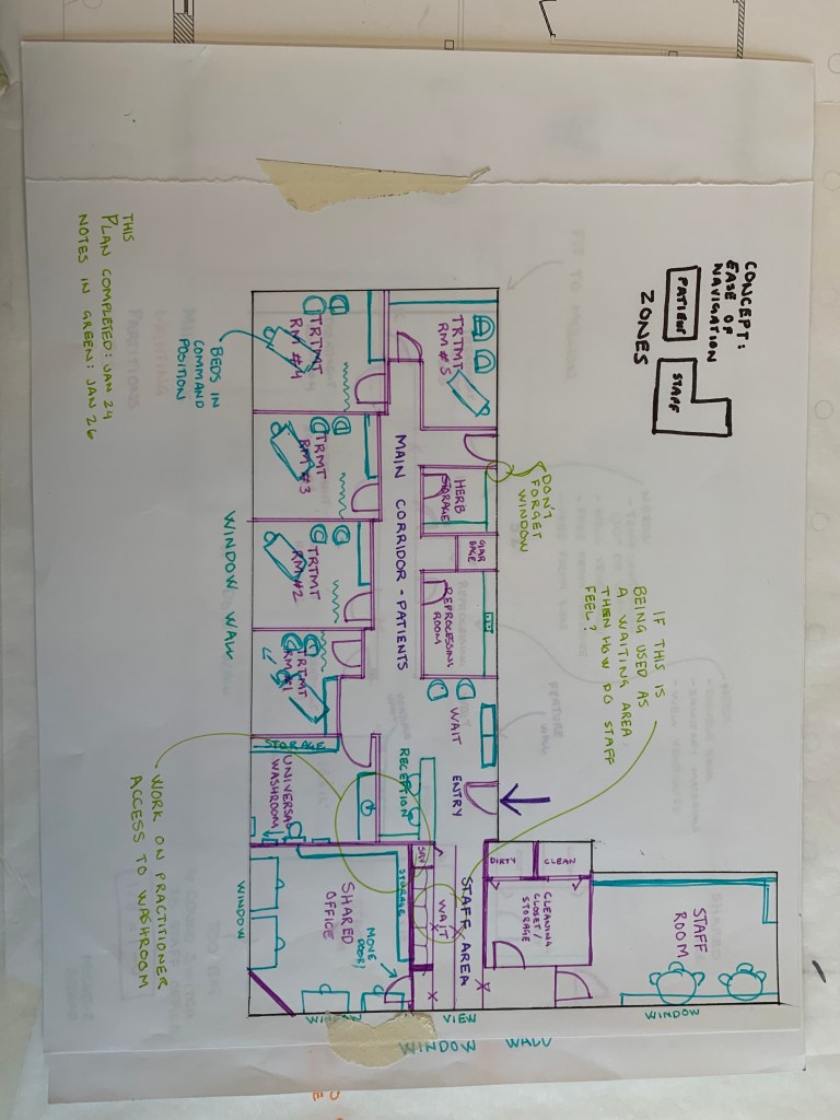 Separation of Patient (blue) and Staff (green) spaces aids in wayfinding ability and patient agency over the space. One central corridor is straightforward yet protects patient privacy through considered sight-lines.