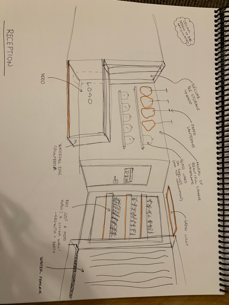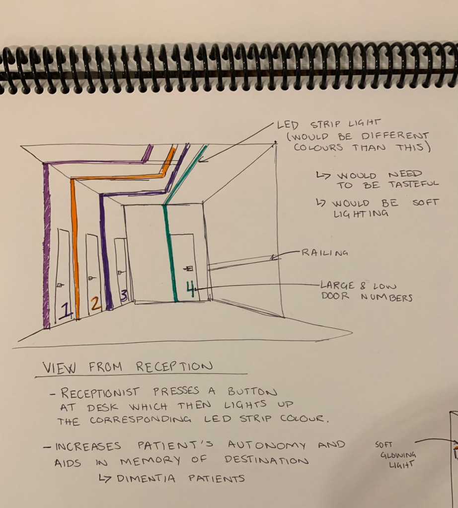 Drawn using ProCreate; the waiting area features two waterfalls which contribute white noise and act as a positive distraction for those about to receive treatment.