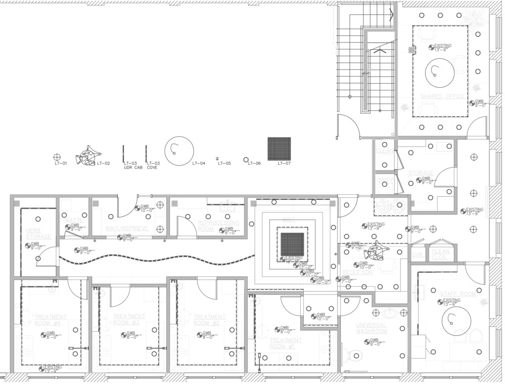 RCP. Cove lighting is used in the treatment rooms to avoid harsh glare when patient is on their back. All lights are dimmable and tuneable to aid patient comfort, and the ceiling feature is a statement in the waiting area to provide distraction.
