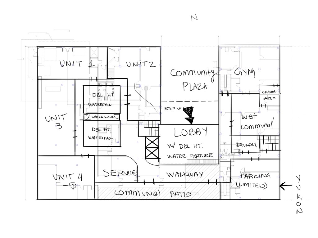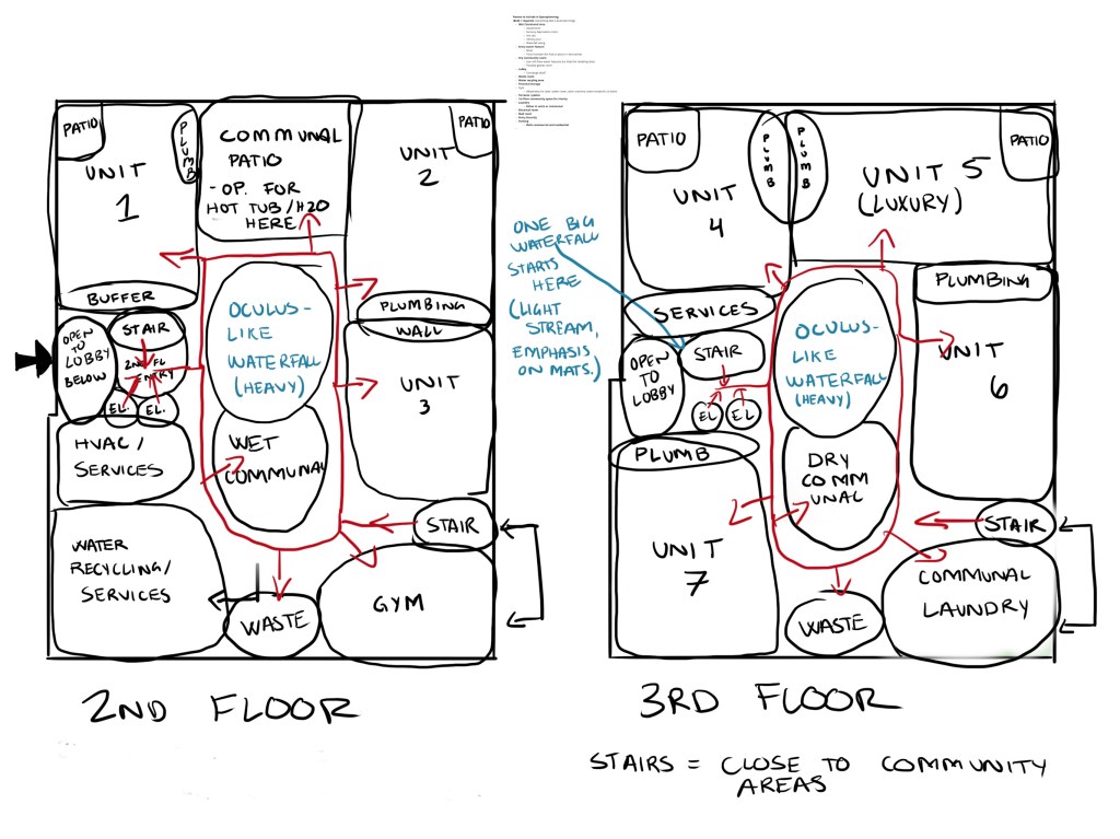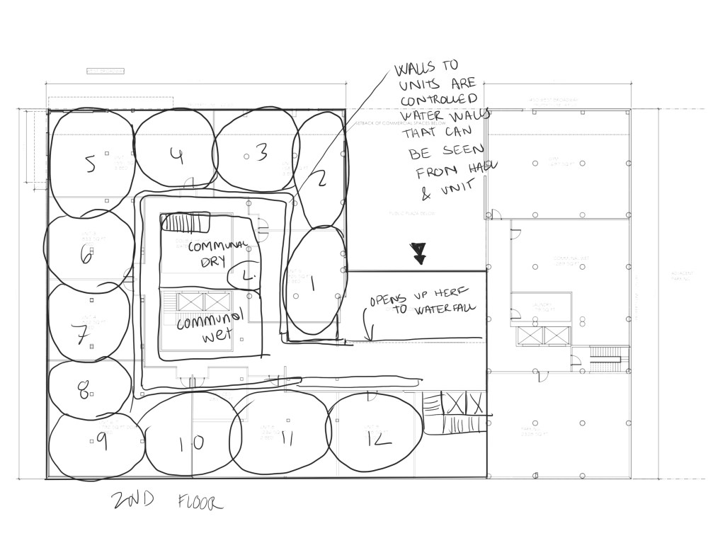 This project called for the design of a multi-unit, mixed use building which improves the wellbeing of those who live there. After a deep dive – pun intended – into the benefits of water and its effects on human behaviour, this building quickly became a haven of layered water elements which calm the senses.