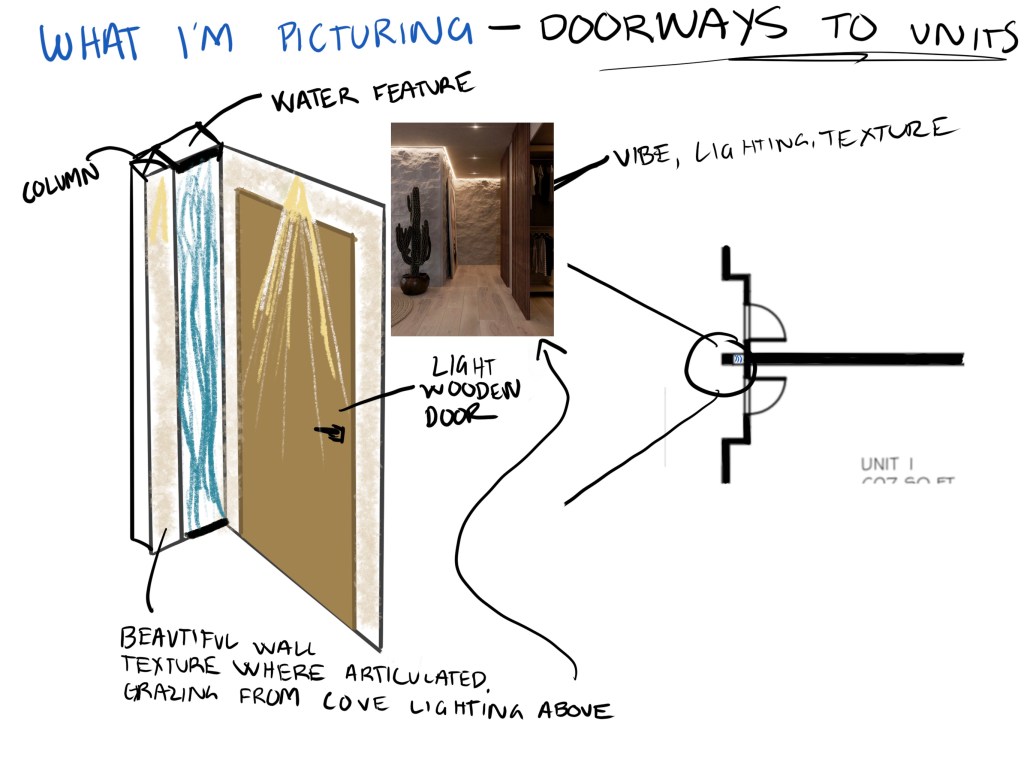 The final material palette of the space is paired back, allowing layered lighting to warm up the space and let water features take center stage.