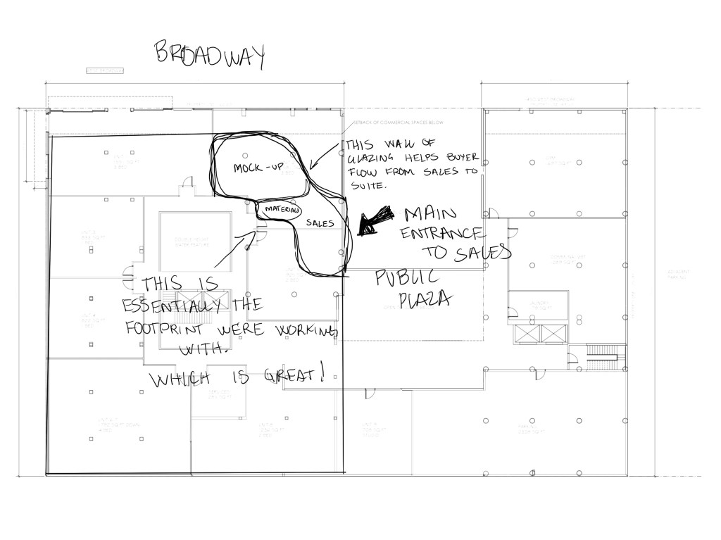 The brief also entailed a presentation center with a mock-up suite to sell the new apartments to potential buyers; making use of foot traffic on Broadway was key to increasing exposure.