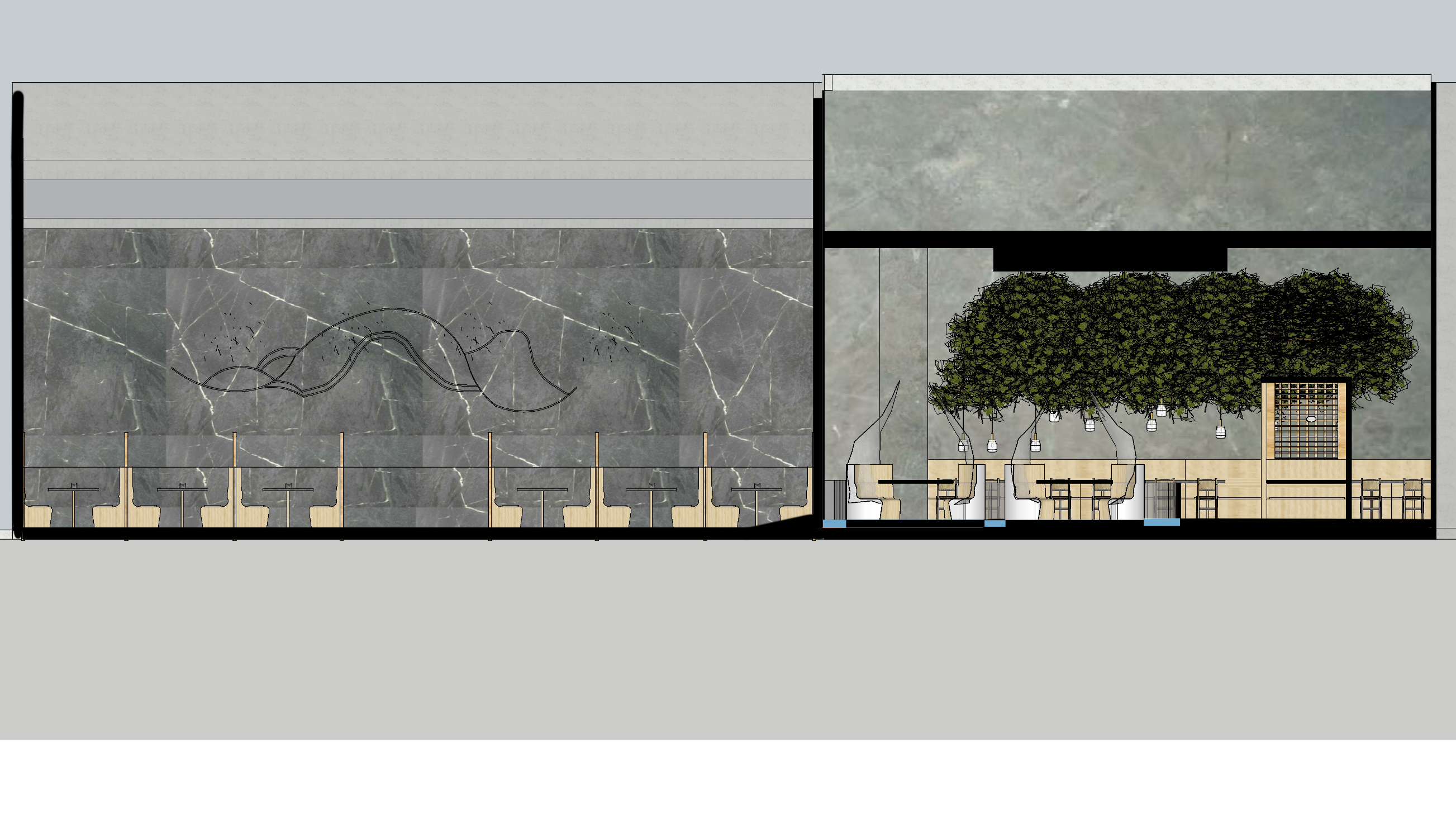 The space plan became about the journey of water through the space, with a waterfall on the back entry wall, a flooring change leads the eye across a bridge and into another section of the restaurant with tables “floating” on open water.