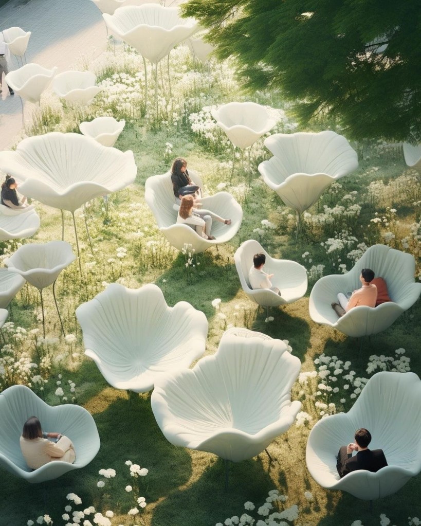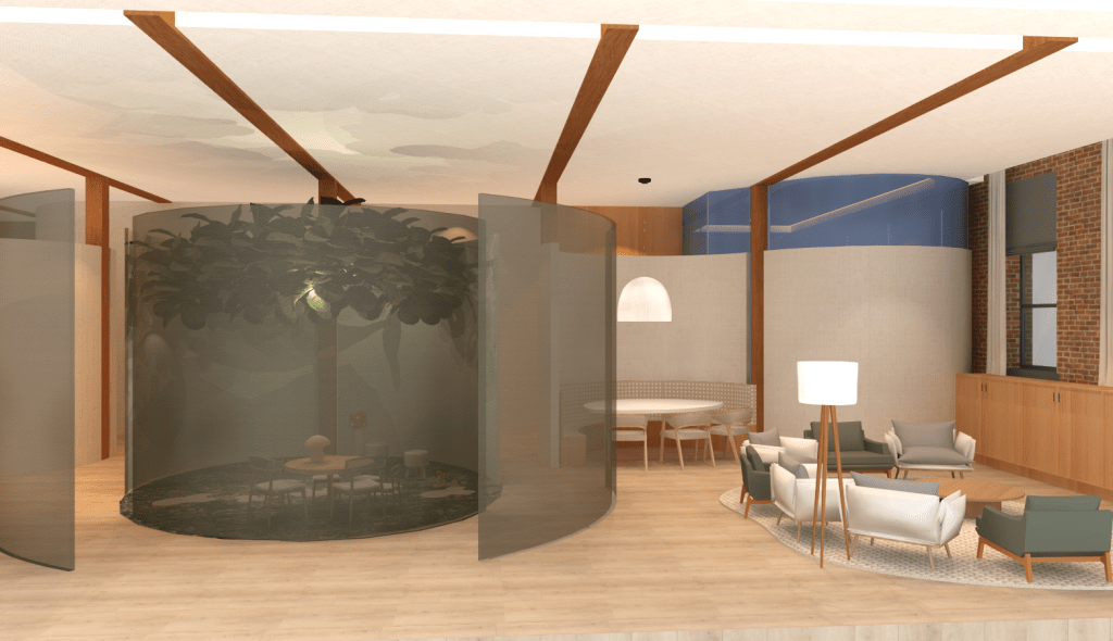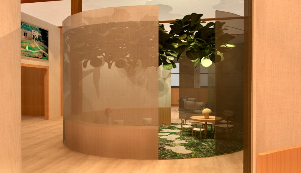 The intimate Lounge Cocoon is meant to feel like a spring day with cherry blossoms forming a protective cover over the space and providing acoustical buffering. This highly-conceptual node in the space is rounded so no one is left out of group conversations.