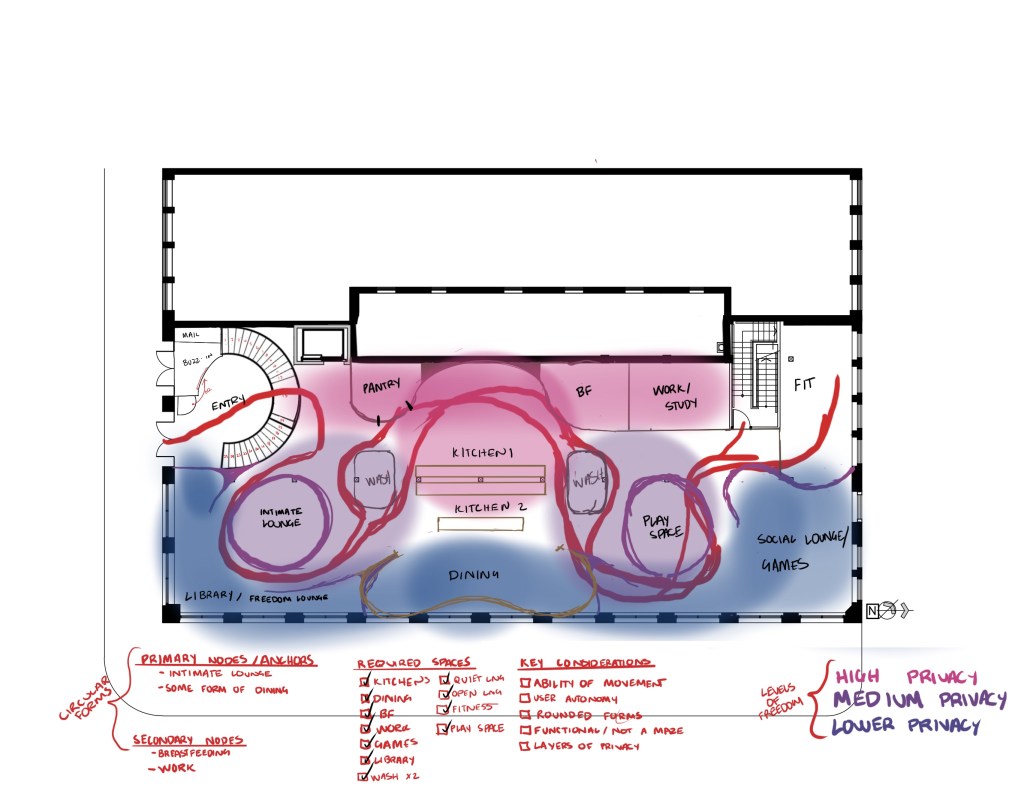 The Atwood is designed to mimic the properties of a cocoon; a layered, protective, community-focused home that supports women and their children through personal growth after trauma. Biophelia and biomorphic forms will define the space and highly conceptual nodes remind users of varying seasonal moments.