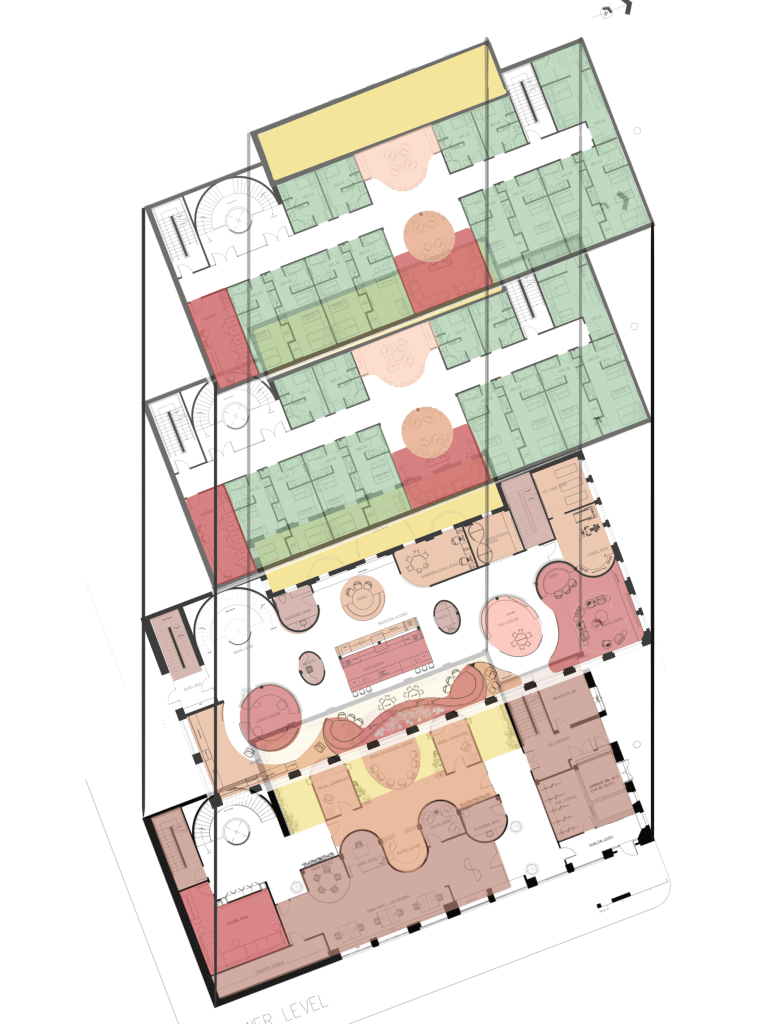 Programmatically, the Atwood needs to serve many different user groups. With 20 staff and 38 residents – 40% of which are children, areas for rest, fun, work, and bonding, are strategically integrated throughout. The Atwood spans over 4 floors and 18,000 square feet.