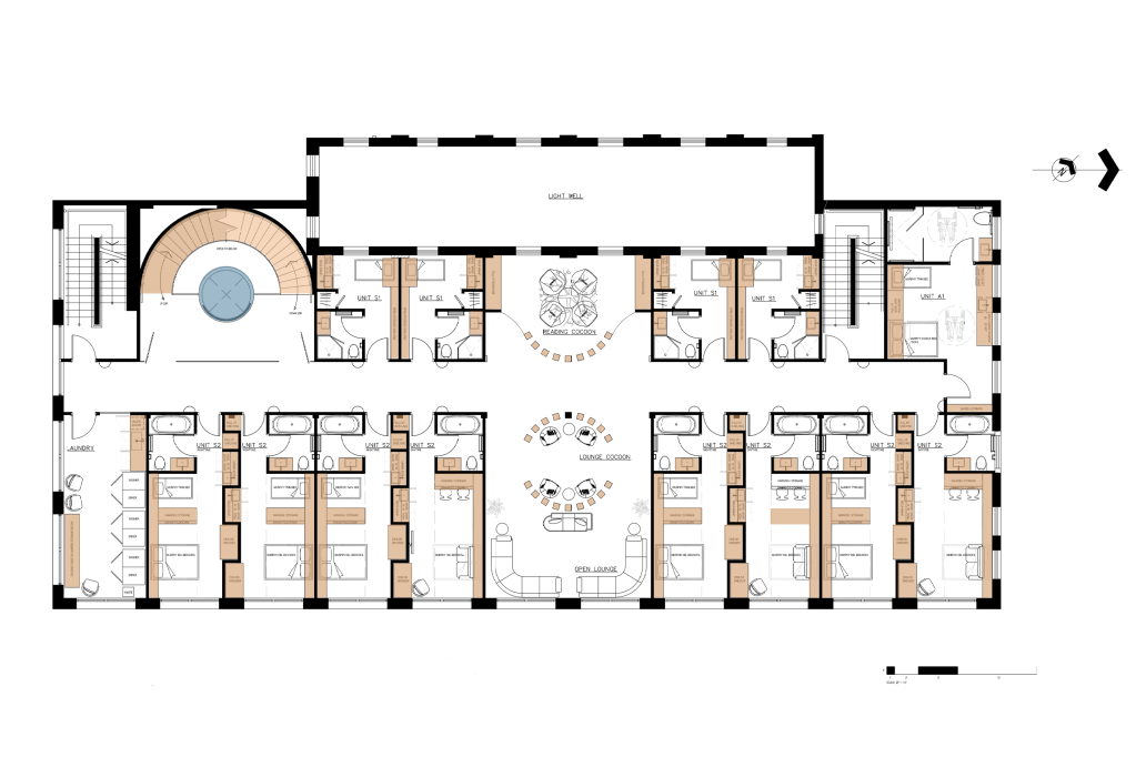 A mix of single-bed, two-bed, and accessible units are aligned over the top two levels of the building. The dwelling levels are on the higher floors to increase the sense of safety and security while sleeping.